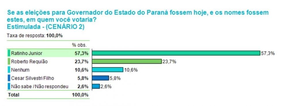 Carlos Massa Ratinho Junior lidera com ampla vantagem a disputa para o governo do Paraná. Comparando-se com outras pesquisas, a filiação de Requião ao PT, com a presença do próprio Lula no evento, não reverte em percentuais para o ex-governador que segue estagnado. Por outro lado, Lula apresentou um certo crescimento.
