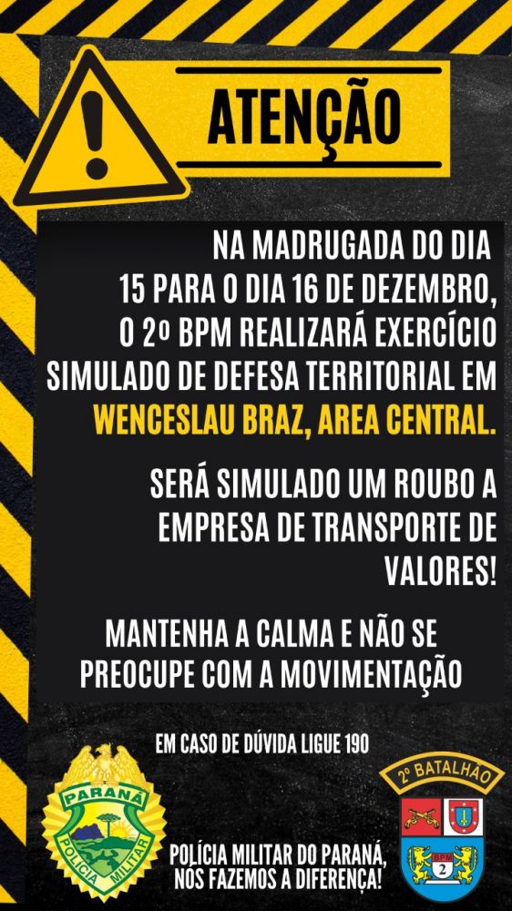 A equipe do 2º Batalhão da Polícia Militar informou, na tarde desta sexta-feira (02), que será realizado um simulado de roubo a uma empresa de valores no município de Wenceslau Braz.