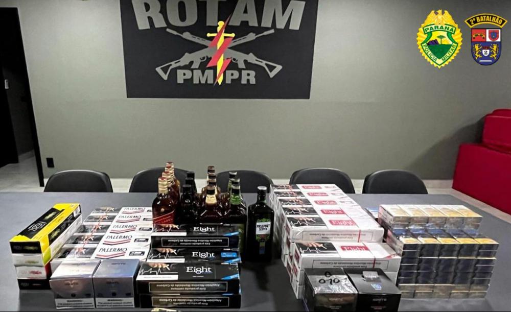 Durante a revista do automóvel, os policiais encontraram no interior do veículo diversos produtos contrabandeados incluindo cigarros do Paraguai, caixas de essência, cigarros eletrônicos e garrafas de whisky.