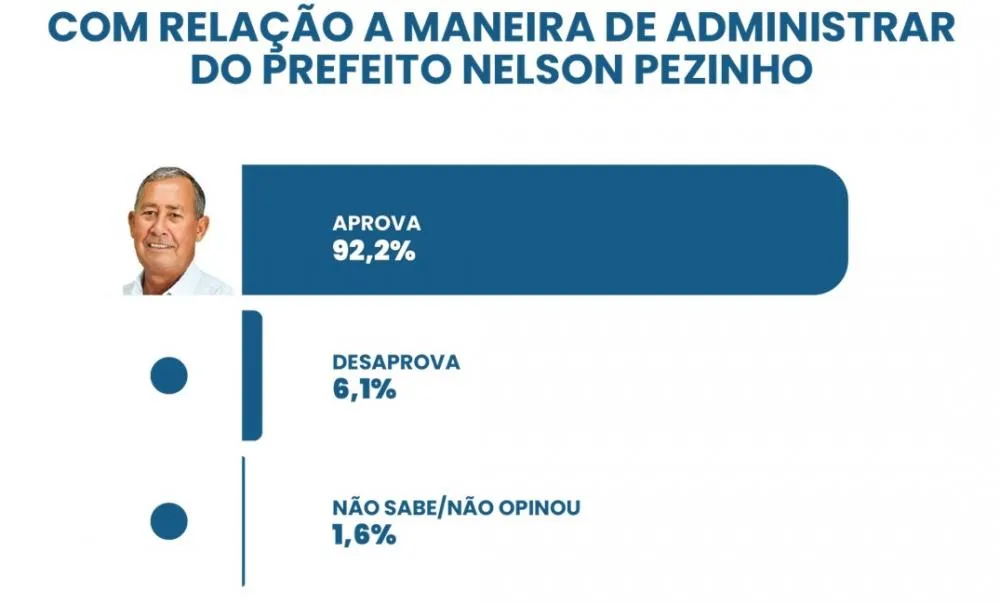 Em relação à gestão municipal, a pesquisa do Instituto Opinião também perguntou às pessoas entrevistadas como elas consideram a administração do prefeito Nelson Pezinho. De acordo com os dados da pesquisa, 92,2% dos entrevistados aprovam a atual administração da cidade, enquanto 6,1% não aprovam. Além disso, 1,6% não quiseram opinar ou não souberam responder.