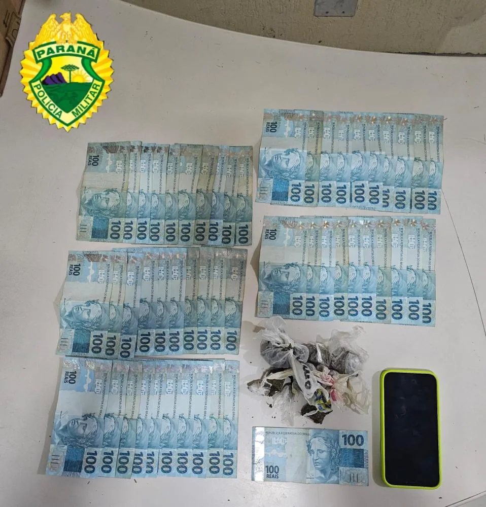 Além das drogas, foram encontrados mais de R$5 mil em dinheiro, possivelmente de tráfico. Foto: Divulgação/PM