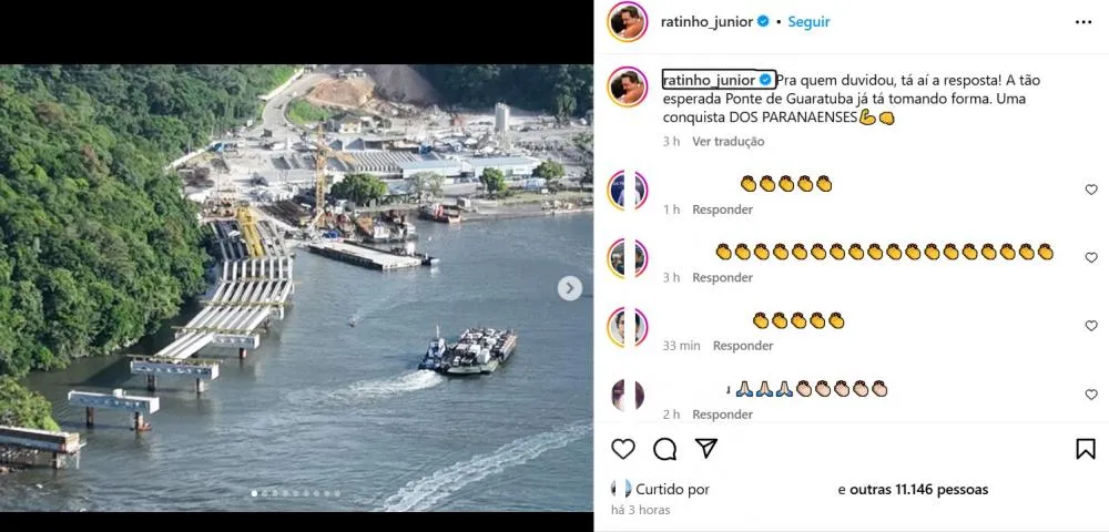O governador do Paraná, Ratinho Junior, divulgou em suas redes sociais imagens que mostram o avanço das obras da Ponte de Guaratuba, uma das construções mais aguardadas do Litoral paranaense. Na publicação, ele destacou a importância do projeto e comemorou seu progresso: "Pra quem duvidou, tá aí a resposta! A tão esperada Ponte de Guaratuba já está tomando forma. Uma conquista dos paranaenses."