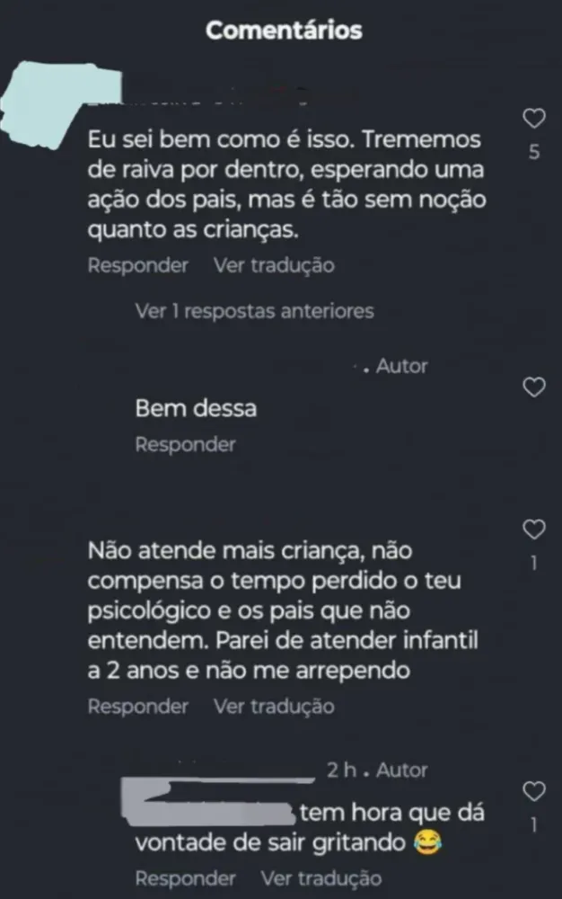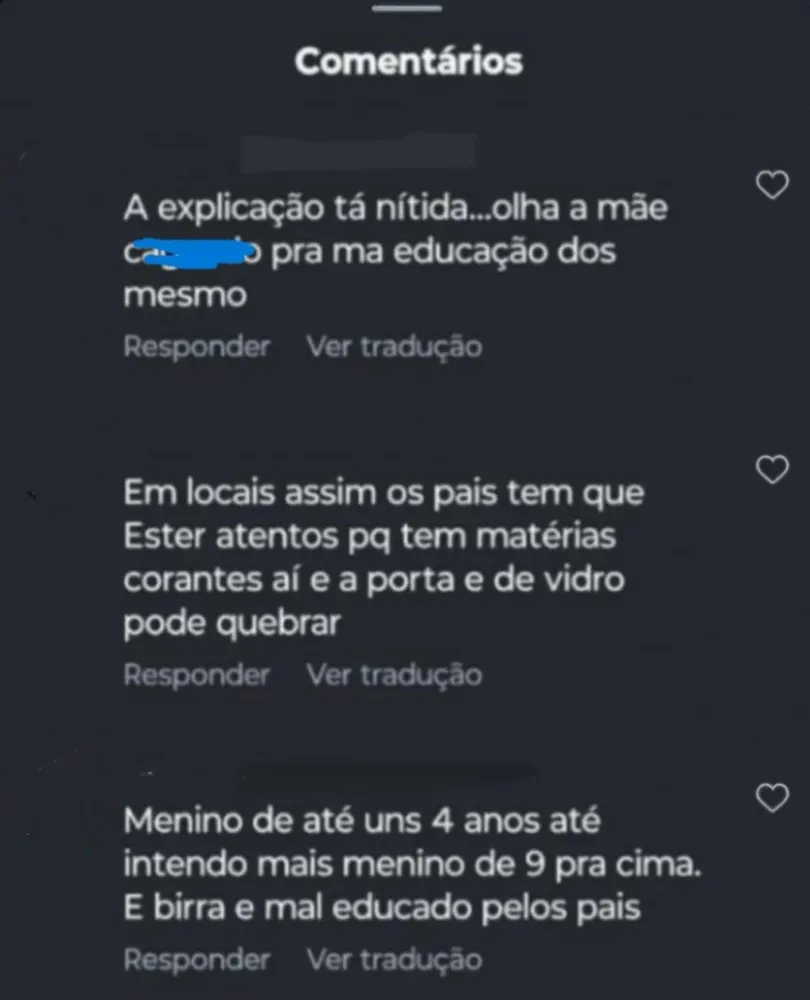 “É birra e mal educado pelos pais”, disse um usuário na publicação. Outros comentários também se relacionavam ao mesmo ponto de vista, expondo a criança ao vexame e constrangimento. “Eu sei bem como é isso. Trememos de raiva por dentro, esperando uma ação dos pais, mas é tão sem noção quanto as crianças”, disse um outro usuário.