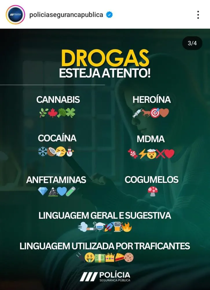 Outra preocupação levantada pela Polícia é o relacionamento com drogas ou organizações criminosas, já que alguns emojis também são associados tanto ao uso quanto ao tráfico de drogas nas redes sociais. “Os pais devem estar atentos ao duplo significado da utilização de determinados emojis, pois podem estar conotados a conversas relacionadas com o consumo/tráfico de drogas. Apesar desta realidade ser (ainda) pouco comum entre a comunidade escolar, a PSP está atenta a este fenómeno, atuando preventivamente nos estabelecimentos de ensino através de ações de sensibilização”, disse o órgão.