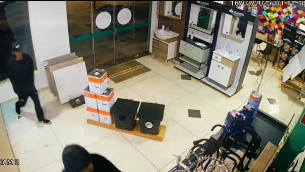 Imagens mostram os indivíduos invandindo um estabelecimento (ao lado esquerdo da tela é possível notar o vidro quebrado). Foto: PCPR