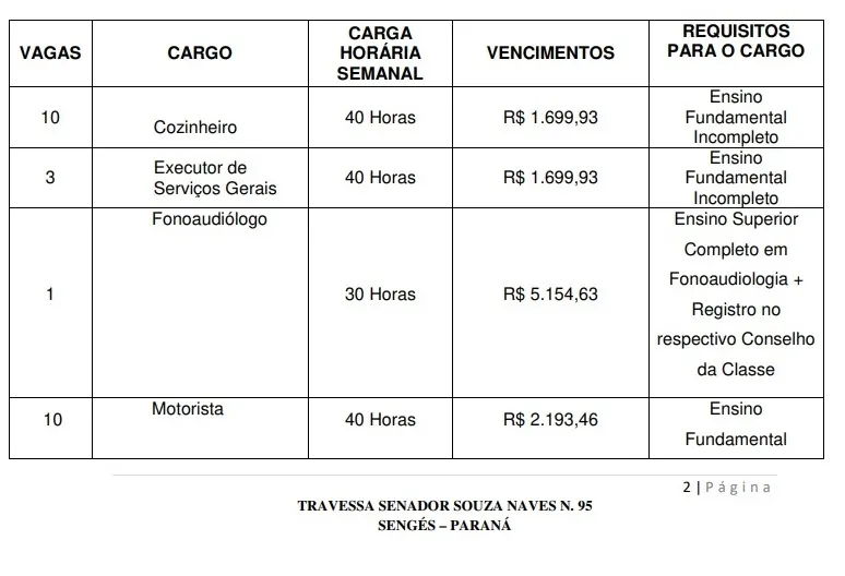 De acordo com as informações contidas no edital de abertura do PSS, estão disponíveis 10 vagas para o cargo de cozinheiro, sendo que a carga horária da vaga é de 40 horas semanais, e a remuneração é de R$ 1.699,93. Para concorrer à estas vagas, os interessados não precisam atender a requisitos, assim como para o cargo de executor de serviços gerais, que possui a mesma carga horária e salário. A diferença é que para este cargo estão disponíveis três vagas.
