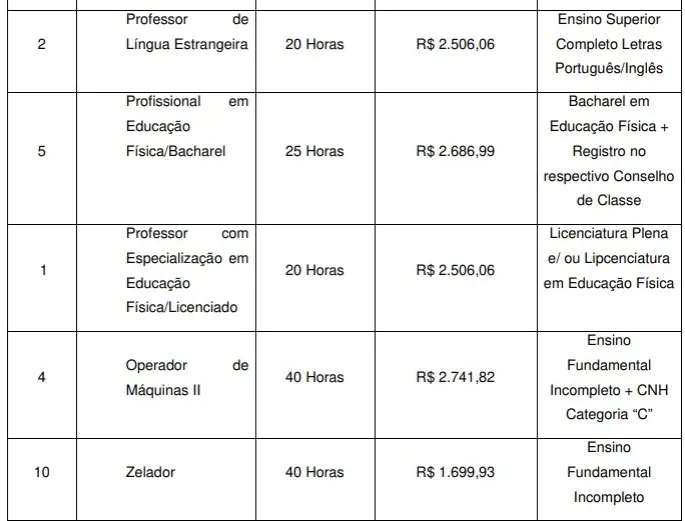 Na área da educação, há duas vagas para professor de língua estrangeira, com carga horária de 20 horas semanais e remuneração de R$ 2.506,06. Para concorrer às vagas, os interessados devem ter ensino superior completo em letras. Ainda na educação, há uma vaga para professor com especialização em educação física, licenciado. Nesta vaga, a carga horária também é de 20 horas semanais e a remuneração também é de R$ 2.506,06. Para concorrer, os interessados devem ter licenciatura plena e/ou lipcenciatura em Educação Física.