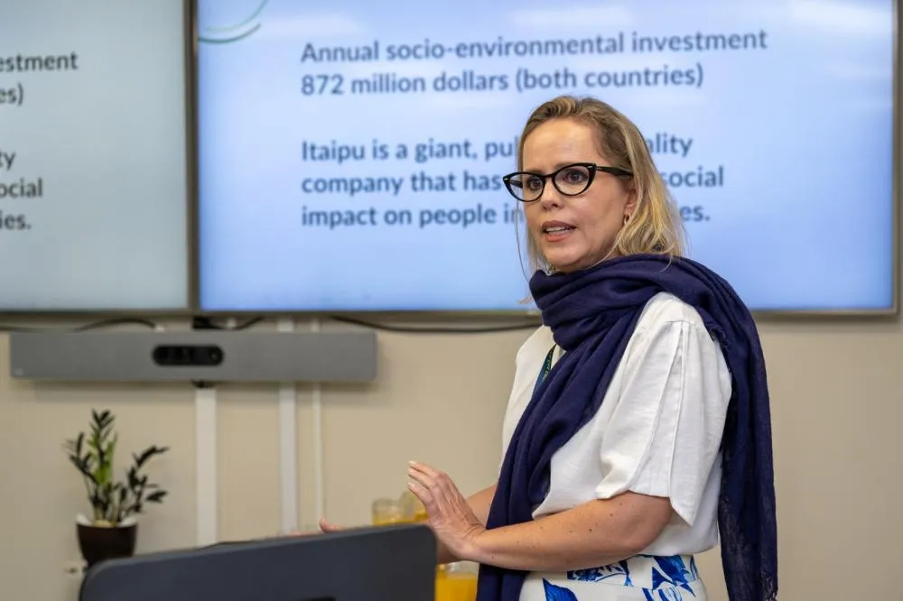 O grupo foi recebido pela assistente do diretor-geral brasileiro da Itaipu, Gisele Ricobom, que falou sobre a dimensão estratégica da Binacional para a economia brasileira e apresentou os principais projetos socioambientais desenvolvidos pela empresa, no Paraná e Mato Grosso do Sul, dentro do programa Itaipu Mais que Energia.