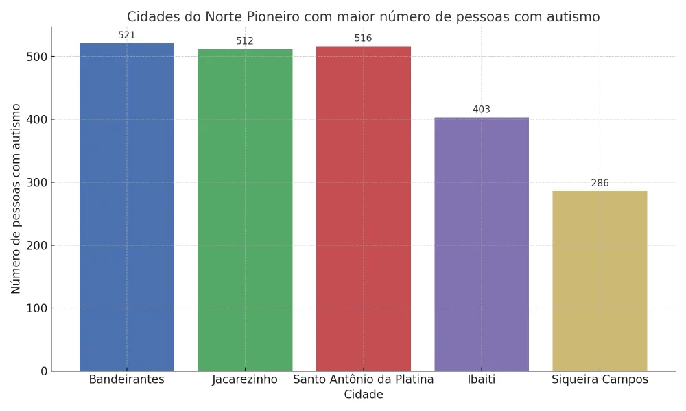 A cidade com a maior quantidade de habitantes autistas da região é Bandeirantes. O município possui 31.273 habitantes e, desse total, 521 pessoas foram diagnosticadas com autismo, representando 1,7% da população total. Em seguida, aparece a cidade de Santo Antônio da Platina, com 516 pessoas autistas, o que representa 1,2% dos seus 44.369. Jacarezinho também está entre os municípios com maior número de diagnósticos, somando 512 autistas, o equivalente a 1,3% da população total, que é de 40.375 pessoas.