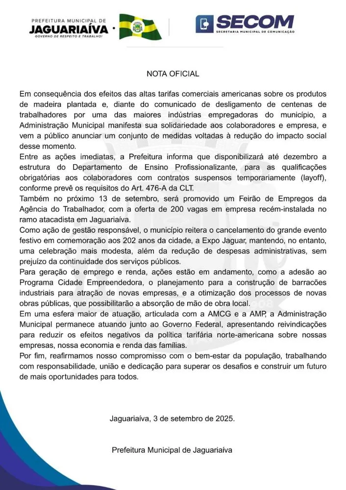 JAGUARIAÍVA - A Prefeitura de Jaguariaíva divulgou nesta quarta-feira (3) um conjunto de medidas para amenizar os efeitos sociais provocados pelo desligamento de centenas de trabalhadores de uma das maiores indústrias do município, a BrasPine. A demissão em massa ocorreu em consequência das altas tarifas comerciais impostas pelos Estados Unidos sobre produtos de madeira plantada.