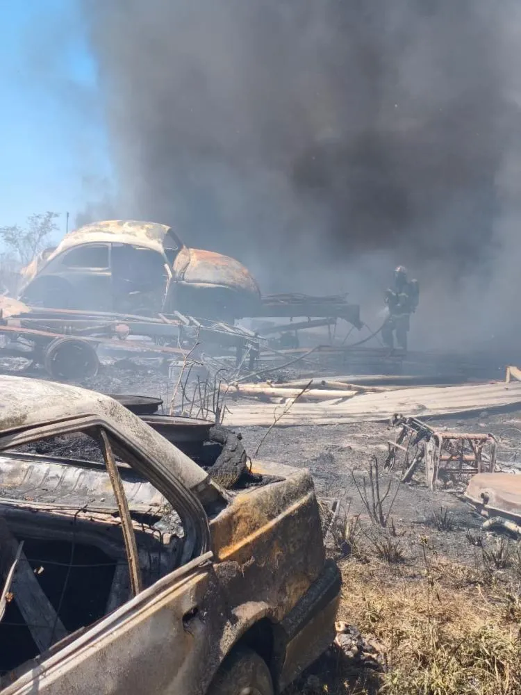 Após o fogo acabar, o cenário do local lembrava uma área de guerra, com barracões e veículos totalmente consumidos pelo fogo.