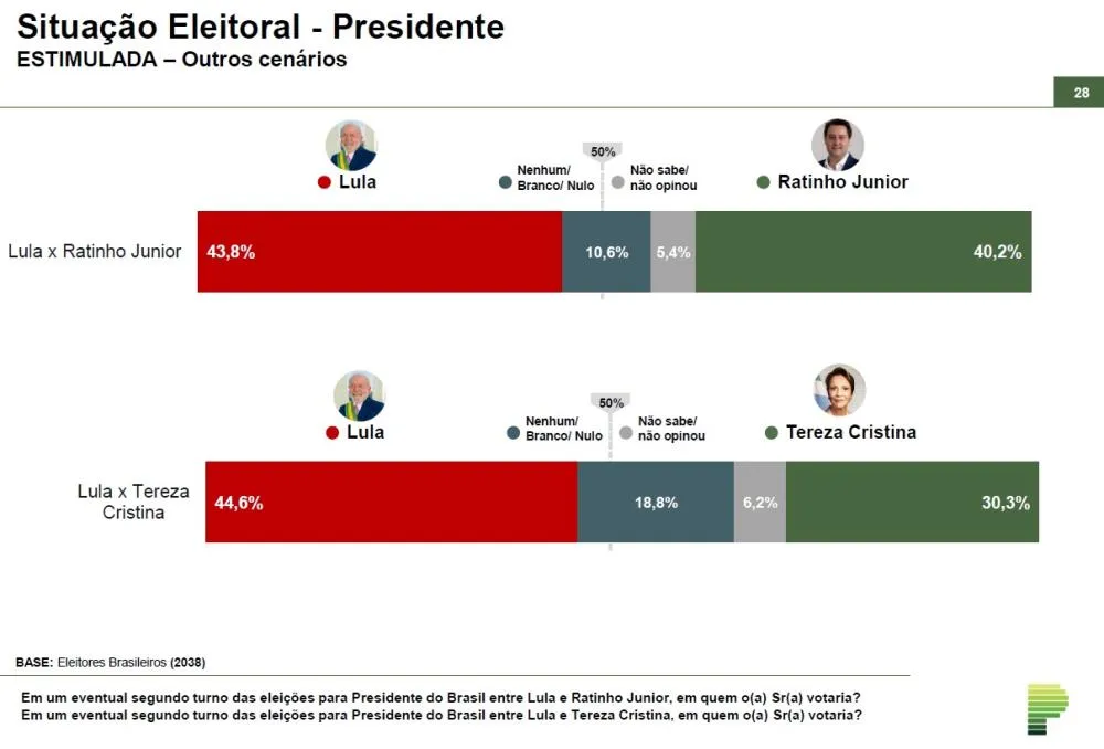 No levantamento, feito com 2.038 eleitores de todo o Brasil, os entrevistados foram perguntados em quem votariam em um eventual segundo turno das eleições para Presidente do Brasil entre Lula e Ratinho Junior. Do total, 40,2% responderam optar pelo Governador do Paraná, contra 43,8% de Lula, o que caracteriza um empate técnico, já que a margem de erro da pesquisa é de 2,2 pontos percentuais para mais ou para menos.