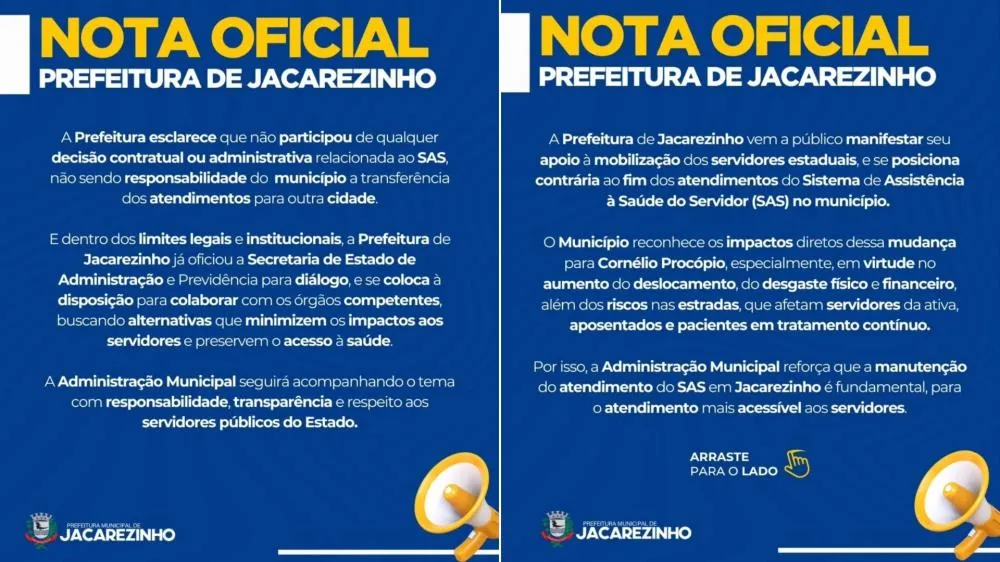 Em um segundo posicionamento, a Prefeitura de Jacarezinho adotou um tom mais político e se colocou contrária ao fim dos atendimentos do SAS no município, manifestando apoio à mobilização dos servidores públicos estaduais. A administração reconhece que a mudança trará impactos diretos, como aumento do deslocamento até Cornélio Procópio, desgaste físico e financeiro dos pacientes, além dos riscos associados às viagens frequentes pelas rodovias da região.